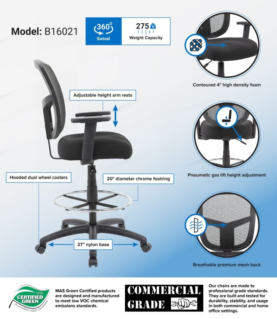The contract drafting stool is a versatile, comfortable seating option for most any office or studio. The drafting stool provides a pneumatic gas lift mechanism for adjustable height options, making this great for a desk or drafting table. It comes in a sleek black color, has a mesh seat and mesh back and has a weight limit of 275 lbs. The stool also features adjustable arms for maximum comfort and a sturdy 27 inch nylon base with 2 inch nylon dual wheel castors for a smooth roll.