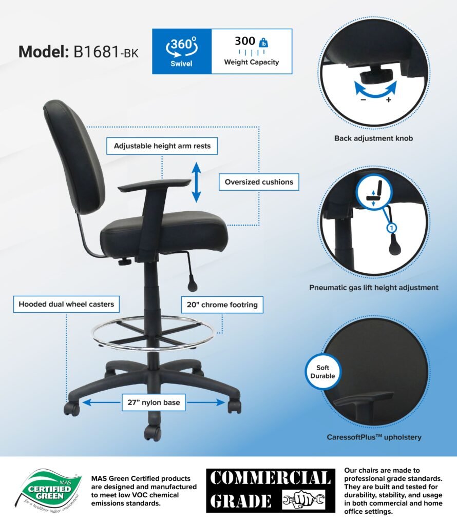 The Oversize Drafting Stool comes with extra-large seat and back cushions. It is upholstered in Black Caressoft. The stool has a pneumatic gas lift seat height adjustment, allowing for versatile adjustment of the seat height to suit your comfort and work environment. It is attached with a 20-inch diameter chrome footring for added leg and foot support. The large 27-inch black nylon base provides added stability to the chair. The hooded double wheel casters make it easy to move and shift directions. The height adjustable arms provide comfortable and versatile arm rests that can suit your personal preferences.