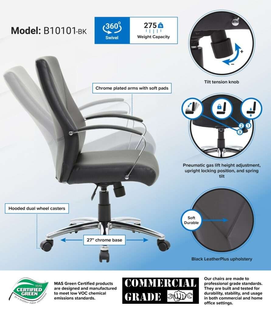 This luxurious chair is upholstered with LeatherPlus, which is known for its supreme softness and durability. Added comfort is achieved by the soft and supple padding over the metal chrome-plated arms. With its adjustable tilt tension control and upright locking position, this chair is a marvel. It has a large, 27-inch chrome base with adjustable height options for the pneumatic gas lift seat. This chair is a step further when it comes to true luxury seating.