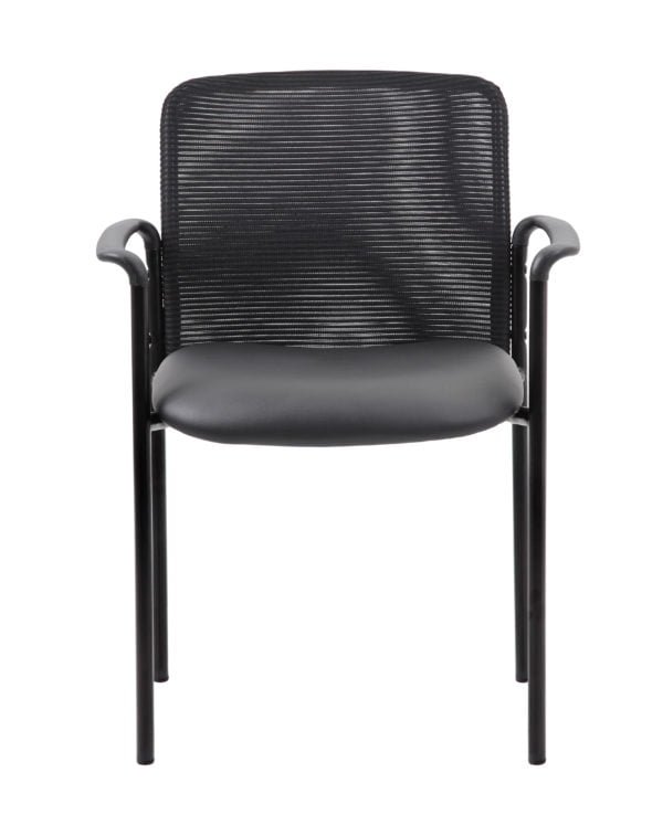 The stackable mesh guest chair in black is the perfect addition to any room or office. For smaller spaces, the chair can be stacked 4 high and stored away when not in use. The chair is at a fixed height with fixed arms and is designed with a vinyl seat as well as a breathable, airy mesh back. The black chair adds a modern, professional appearance to any space and has a weight limit of 275 lbs.