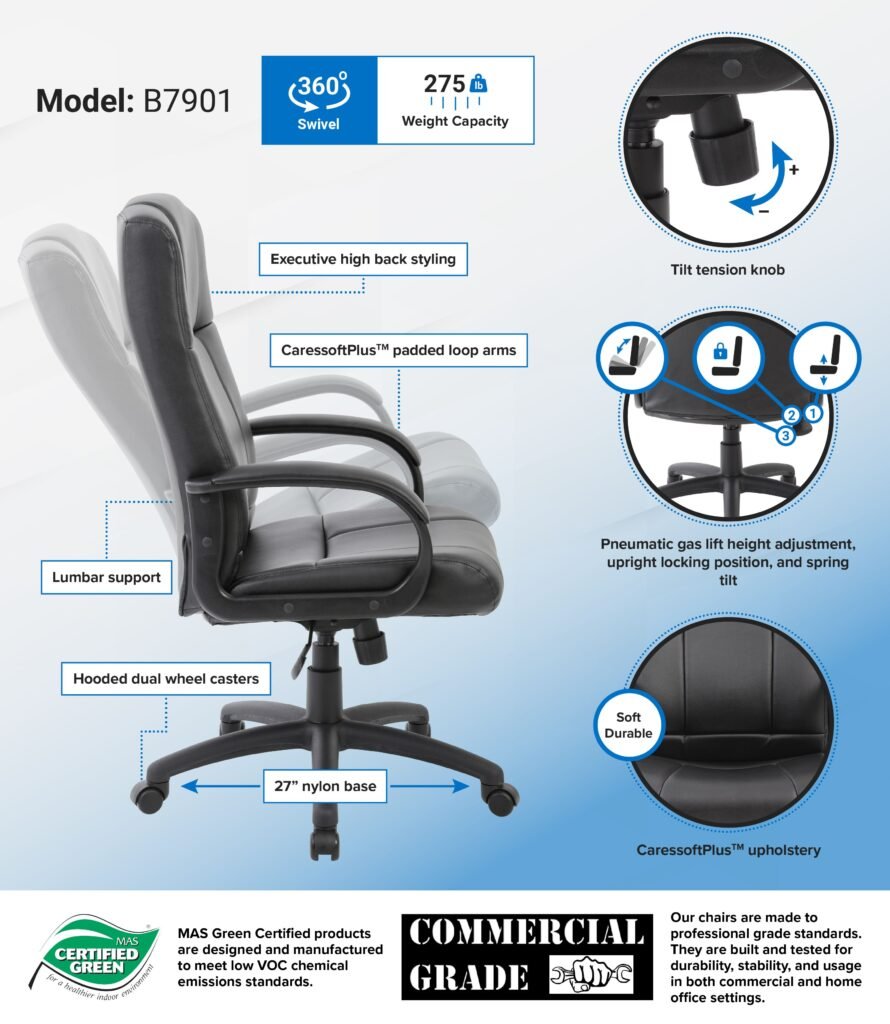 This executive high back chair is elegantly upholstered with extremely soft and durable Caressoft vinyl. It features integrated lumbar support and padded armrests decorated in comfortable CaressoftPlus upholstery. Additional features include an upright locking position, adjustable tilt tension control, and pneumatic gas lift seat height adjustment for a seat height that extends from 20-inch to 23.5-inch. All of this sits atop a sturdy 27-inch nylon base with five hooded double wheel casters for exemplary stability and maximum mobility.