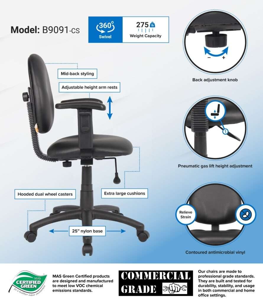 This mid back ergonomic task chair is the perfect way to increase productivity and remain comfortable while doing so. Its contoured back seat promotes proper posture that prevents back strain, while its extra large seat and back cushions ensure maximum comfort. Additional features include adjustable arms, pneumatic gas lift seat height adjustment, black Antimicrobial vinyl upholstery, and adjustable back height and depth. It is available in four colors, so there are plenty of options for matching your existing color scheme.