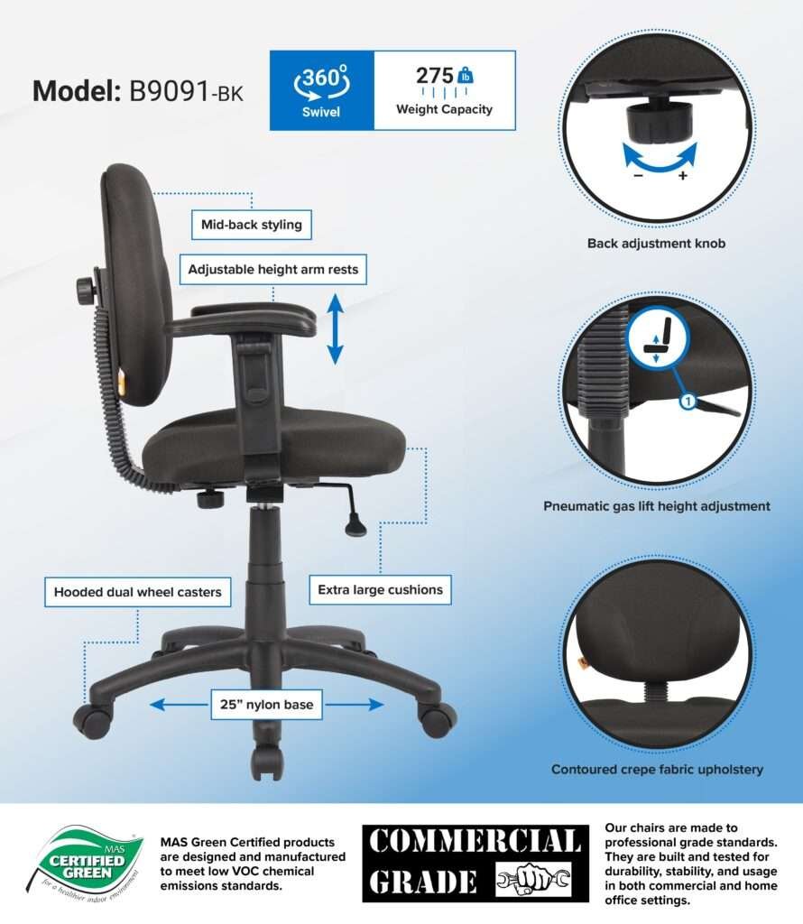 This mid back ergonomic task chair is the perfect way to increase productivity and remain comfortable while doing so. Its contoured back seat promotes proper posture that prevents back strain, while its extra large seat and back cushions ensure maximum comfort. Additional features include adjustable arms, pneumatic gas lift seat height adjustment, black upholstery, and adjustable back height and depth. It is available in four colors, so there are plenty of options for matching your existing color scheme.