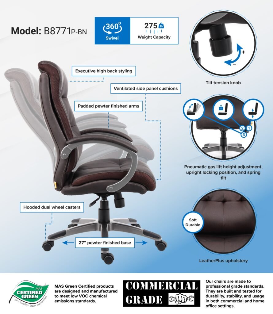Take comfort to the next level with this double plush high back executive chair. Beautifully upholstered in brown LeatherPlus, a soft and durable combination of leather and polyurethane, the chair is as comfortable as it is stylish. Its back and seat cushions have vented mesh panels for efficient air circulation. Additional features include pewter arms and base, adjustable tilt tension control, upright locking position, and pneumatic gas lift seat height adjustment. All of this sits atop a large nylon base with five hooded double wheel casters.