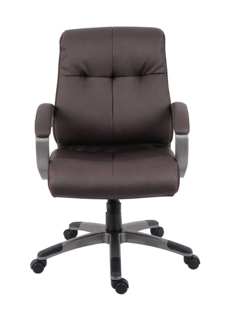 Our double plush mid back chair ensures a relaxing seating experience. It is beautifully upholstered in durable brown LeatherPlus, a comfortable combination of leather of polyurethane. A perfect addition to any office setting, its seat and back cushions feature ventilated mesh side panels for efficient air circulation. Additional features include pewter arms and base, adjustable tilt tension control, upright locking position, pneumatic gas lift seat height adjustment, and five hooded double wheel casters for optimal mobility.