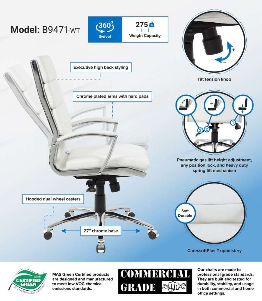The executive CaressoftPlus chair in white with the metal chrome finish is as comfortable as it is handsome. The chair utilizes a two paddle mechanism which designates one paddle for lift and one paddle to release spring tilt or lock; it is very heavy duty. The chair is made with a material called CaressoftPlus which is a trademarked vinyl that is an ultra-soft, breathable upholstery that looks & feels like leather, but more durable & easy to clean. The chair also offers tilt tension, a pneumatic gas lift and an upright lock. It has been designed with a sturdy 27 inch chrome base with 2 inch nylon dual castor wheels and has a weight capacity of 275 lbs.