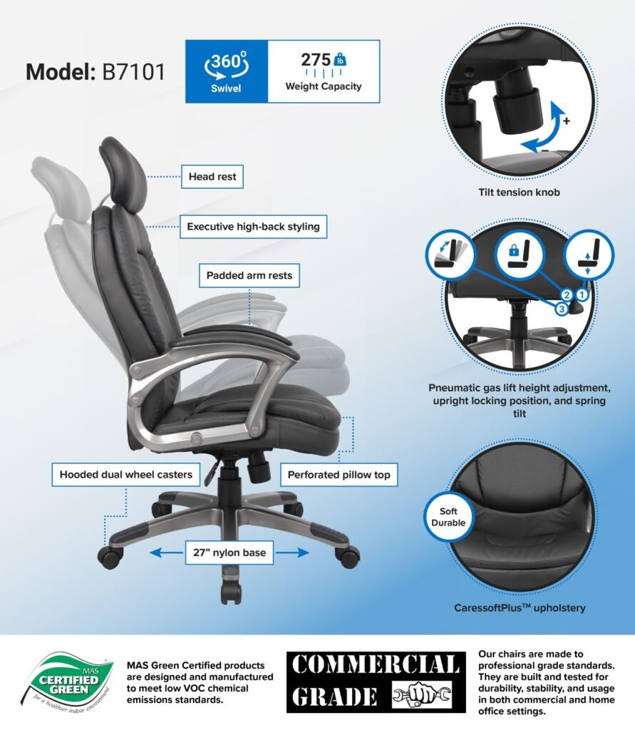 Our high back executive chair features a patented perforated pillow top design and is beautifully upholstered with impeccably soft, durable Caressoft upholstery. Additional features include a tasteful pewter finish, padded armrests, and comfortable cushions. Structurally, the chair has an upright locking position, pneumatic gas lift seat height adjustment, and adjustable tilt tension control. Of course, all of this is supported by a sturdy nylon base that is propped up by five hooded double wheel casters.