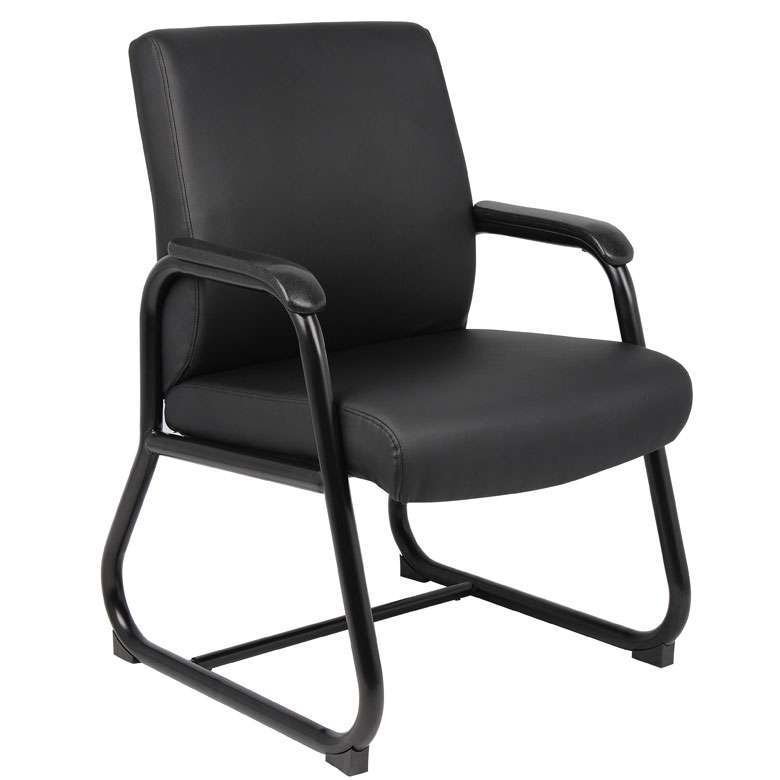 This heavy-duty guest chair is created with a material called Antimicrobial Vinyl. The chair is at a fixed height with fixed arms and sits on a sturdy, stationary black sled base. This chair adds a sleek, minimalist seating option for most any room or office. The chair also has a weight limit of 350 lbs.