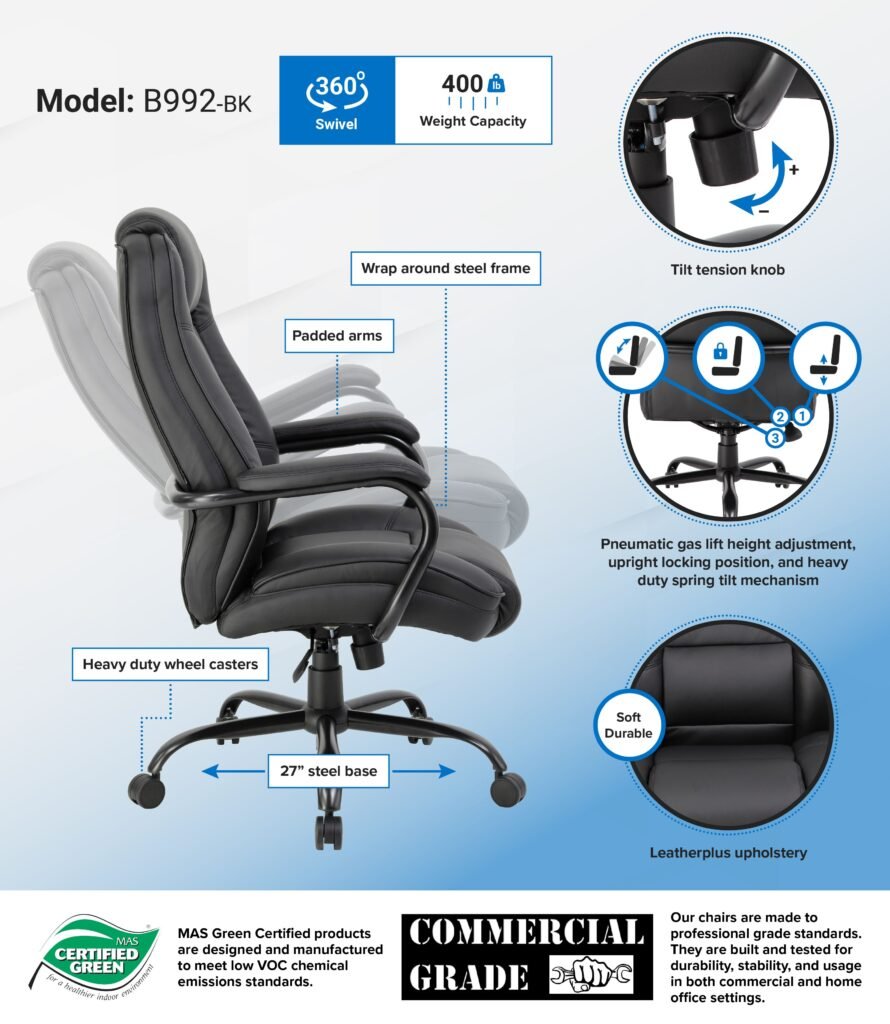 Our heavy duty executive chair is the perfect addition to any office, board room, or study. Its 400 pound weight capacity renders them compatible with a broad range of different body types. Beautifully upholstered in LeatherPlus, a durable combination of leather and polyurethane, the chair is as comfortable as it is durable. Additional features include padded arms oriented in steel wrap around style construction and reinforced lumbar support. It also features improved pneumatic gas lift seat height adjustment, and a heavy duty spring tilt mechanism.