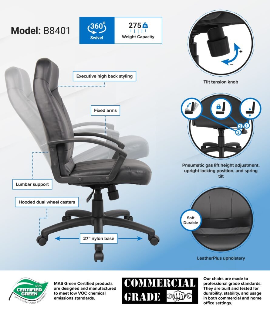 This executive leather chair is elegantly upholstered in black LeatherPlus, a combination of leather and polyurethane that is as comfortable as it is durable. It also has polypropylene arms and a matching 27 nylon base with five hooded double wheel casters. In addition to providing optimal stability, this chair can also be personalized for maximum comfort. Its upright locking position, pneumatic gas lift seat height adjustment, and adjustable tilt tension control let users customize the chair to their liking.