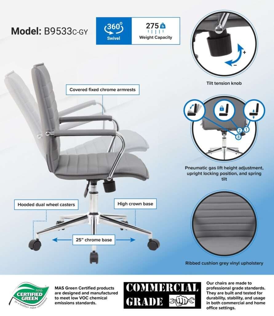 This hospitality task chair in grey vinyl is designed with fixed chrome arms for that pop of metallic color that brings any room or office to the next level. The chair also features a gorgeous and strong chrome 25 inch base with 2 inch nylon dual wheel castors. In addition to looking fantastic, the chair also features a spring tilt mechanism, a pneumatic gas lift for easy height adjustability, tilt tension and an upright lock, while also boasting a weight capacity of 275 lbs.