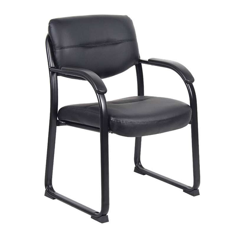 This beautiful guest chair is elegantly upholstered in Black LeatherPlus for comfort and durability. It has padded armrests which provide an extra layer of comfort, while its polished tubular steel frame and black powder coated finish promote a stylish aesthetic that?s as sturdy as it is eye-catching. Additional features include thick contoured cushions, curved arms that easily clear front edges when the chair pulled close to a table, and a contoured seat that provides efficient lumbar support.