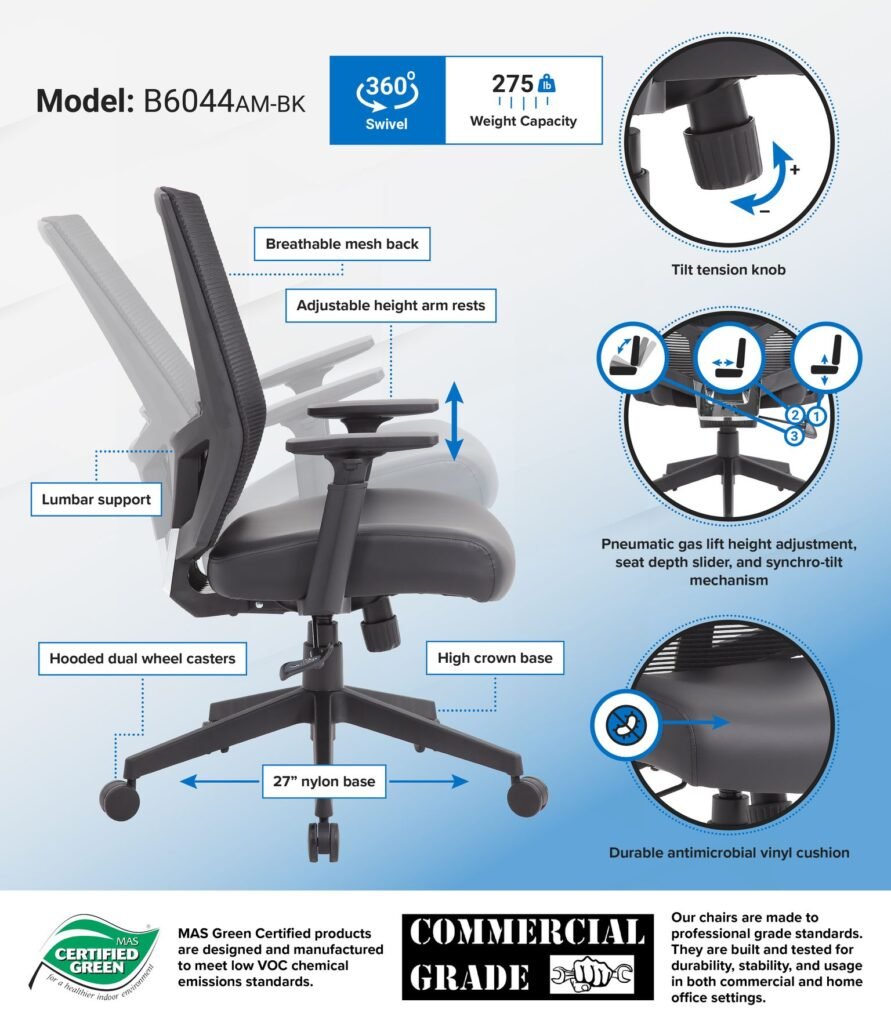The breathable mesh back task chair is designed with comfort and ease in mind. It’s seat cushion is upholstered in a durable and cleanable antimicrobial vinyl. The chair features a 2:1 synchro-tilt mechanism for added comfort. This allows the backrest and seat to tilt in unison.and it also includes a tilt tension knob which allows you to adjust the tilt tension for optimal support. The chair also features height adjustable arms, a pneumatic gas lift that allows for easily adjustable height and it has a maximum weight capacity of 275 lbs. The chair has a 27″ nylon base and 2 -inch hooded, double wheel, casters.