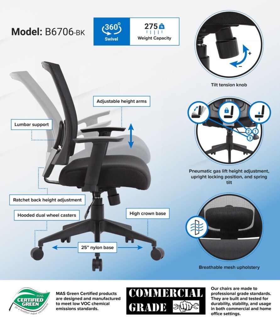 Our mesh back task chair provides comfort and ergonomic support for any office environment. It features ratchet back height adjustment, two adjustable height armrests, a pneumatic gas lift seat for easy height adjustment, and adjustable tilt tension control. Its versatility is augmented by a black mesh back with lumbar support and a breathable black mesh fabric seat. All of this is supported by a 25 black nylon high crown base and five hooded double wheel casters.