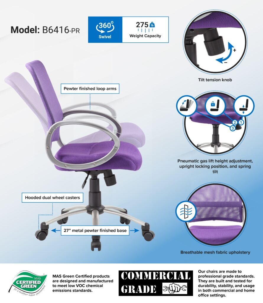 This mesh back task chair in purple with a pewter finish is a fun modern design and adds a pop of color to any office or room. The chair has a 275 lbs. weight limit and provides a pneumatic gas lift mechanism for adjustable height options also offers tilt tension, a spring tilt mechanism and an upright lock. The chair also offers a sturdy 27 inch pewter base with 2 inch nylon dual wheel castors for a smooth roll.
