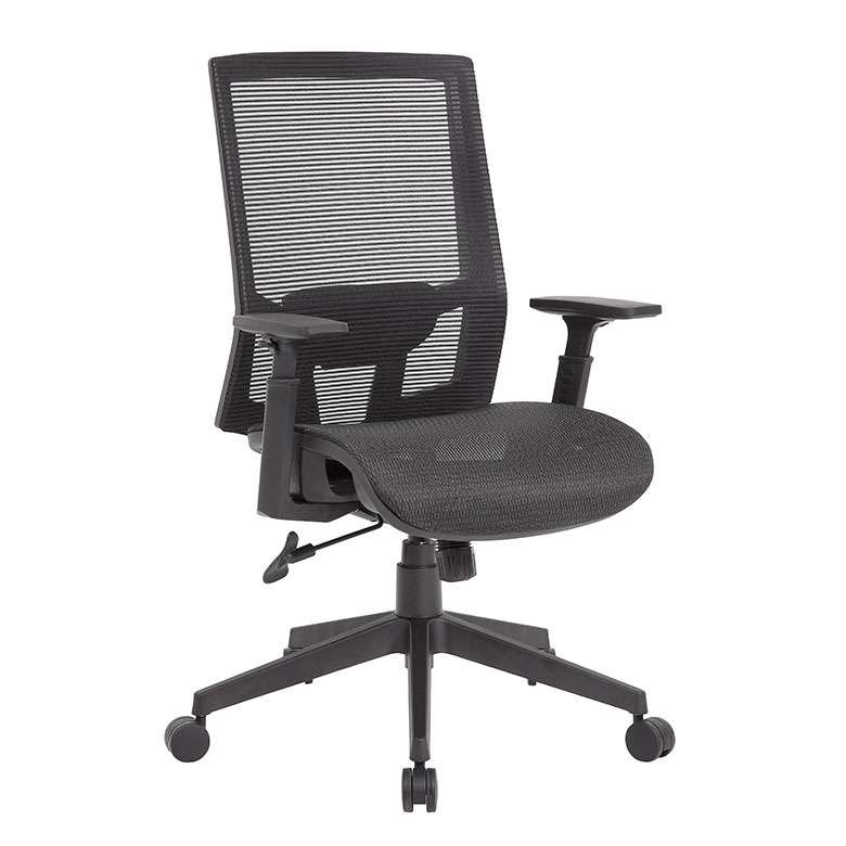 The breathable mesh back and seat task chair is designed with comfort and ease in mind. The chair features a technology called a Synchro-Tilt Mechanism. This allows the backrest and seat to tilt in unison. The back tilts more than the seat with a 2:1 ratio and it also includes a tilt tension knob which allows you to adjust the tilt tension for optimal support. The chair also features height adjustable arms, a pneumatic gas lift that allows for easily adjustable height and it has a maximum weight capacity of 275 lbs. The chair has a 27″ nylon base and 2 -inch hooded, double wheel, casters.