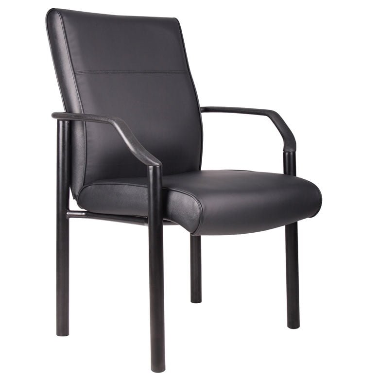 This guest chair is the perfect companion piece to our executive mid back LeatherPlus chair. Like its counterpart, this chair is upholstered with black LeatherPlus, a polyurethane-infused leather that provides both softness and durability. It features a seat height of 19, an arm height of 26, and an overall seat size of 19.5 W x 21 D. After a completing relatively straightforward assembly, users can adjust the glides at the bottom of each leg to prevent any wobbling.