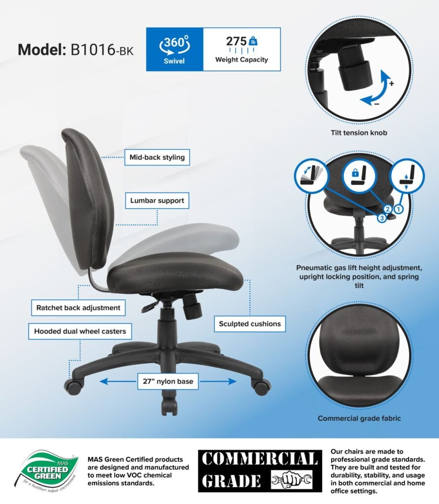 This beautiful chair is as unique as it gets with its sculptured seat made from molded foam with perfect contours to fit the shape of your body. With its ratchet back height adjustment, this mid-back style chair provides excellent lumbar support. Commercial grade fabric has been used for its upholstery. The large 27-inch nylon base provides immense stability while the pneumatic gas lift provides instant height adjustment of the seat.