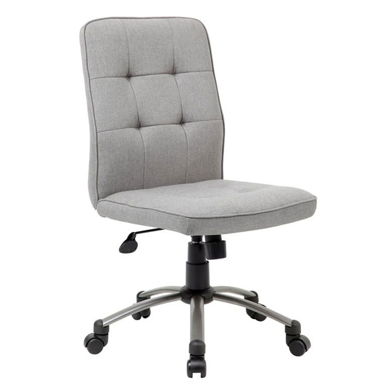 The modern office chair in taupe is made with commercial grade linen and features a 27 inch chair base that is designed with fancy pewter finish with black end caps and has 2 inch nylon dual wheel castors for smooth rolling. The chair has a 275 lbs. weight limit and provides a pneumatic gas lift mechanism for adjustable height options, making this great for most any desk or work table. In addition to the adjustable height the chair also offers tilt tension, spring tilt and an upright lock