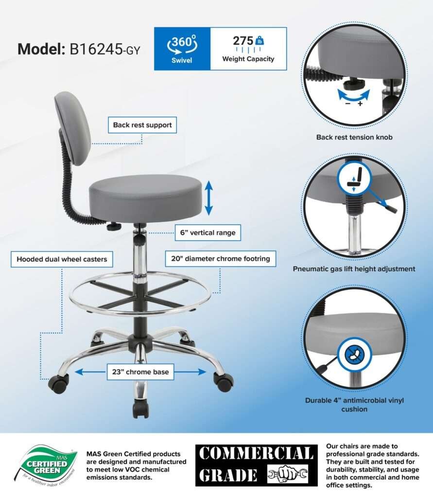 This medical stool is upholstered in durable Grey, easy to clean Caressoft vinyl, and equipped with a 4-inch thick molded foam seat that provides improved durability. Its plush back cushion provides comfortable back support for extended periods of work. It is attached with an easy to reach gas lift seat height adjustment lever, providing a vertical range of 6-inch to suit your comfort and work environment. The stool’s 20-inch chrome footring provides added foot and leg support. The hooded double wheel casters make it easy to move and shift directions.