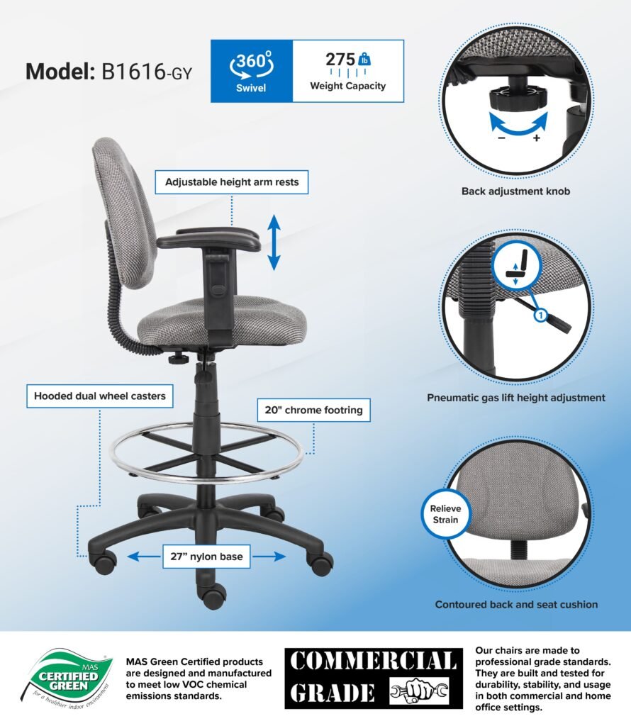 This grey tweed drafting stool comes with an easily adjustable pneumatic gas lift seat height adjustment, to help you find the personalized sitting style that suits you and your work environment. The contoured back and seat can help relieve back strain through extended periods of work. The 20-inch diameter chrome foot ring provides added foot and leg support. The Euro-style nylon base provides greater stability to the stool by spreading the load over a larger surface area, and the heavy duty dual wheel casters make it easy to move and shift directions. The height adjustable arms provide comfortable and versatile arm rests that can suit your personal preferences.